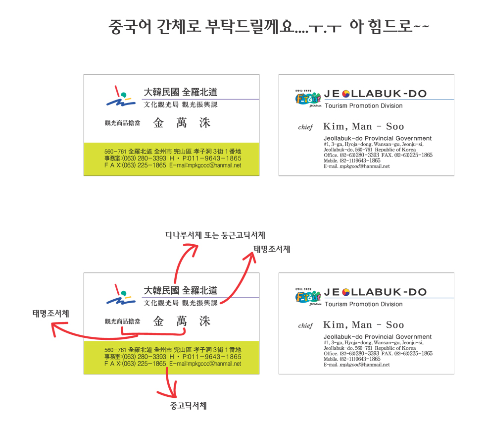 중국어 간체로 명함글씨 아웃라인 부탁드려요...ㅜ.ㅜ 혀리 일반 0 7111 2007.02.06 19:47 -0001.11.30 00:00 jj.ai (0byte) + 34 아무리 방법을 모색해도 할수가 없네요... 오늘 인쇄해야하는데..ㅜ.ㅜ 염치불구하고 올려봅니다...부탁드릴께요...ㅜ.ㅜ